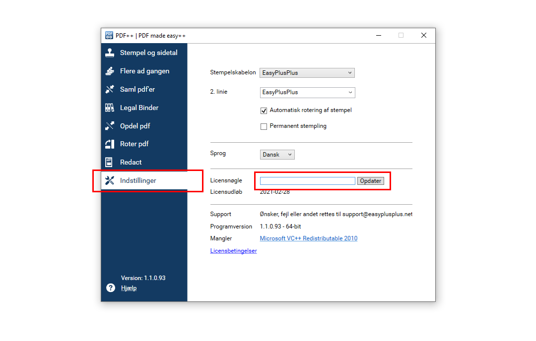 Licensnøglen indtastes på fanen “Indstillinger”.