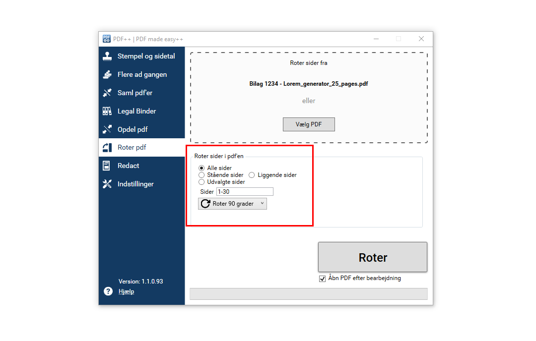 - Klik på 1. linie i “Opdel PDF” og skriv 1-?
