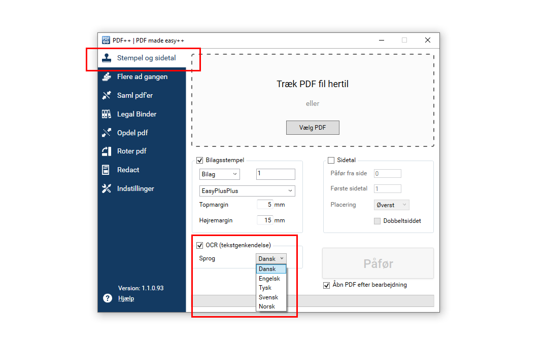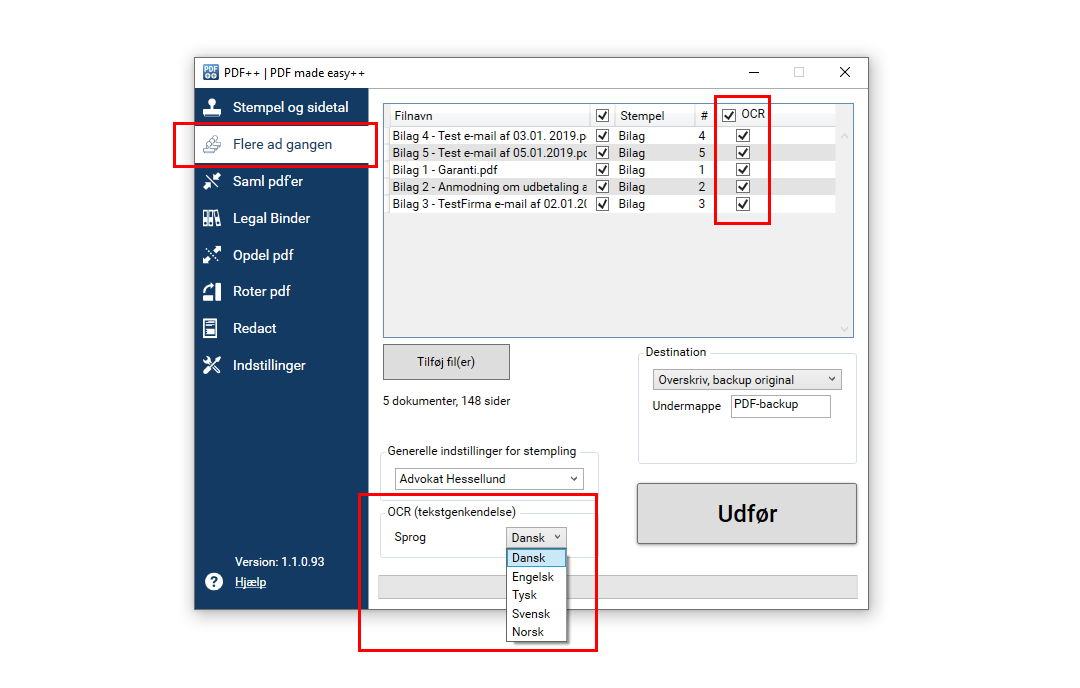 - Klik på OCR og vælg sporg for den eller de pdf´er som ønskes søgbar.